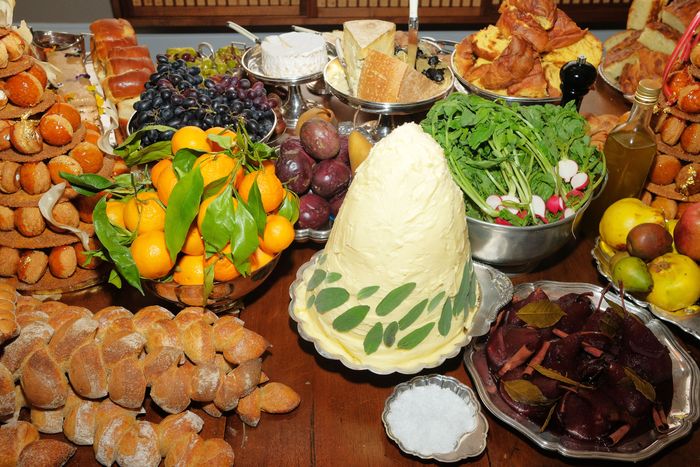 7 p.m. | The guests, mostly girls and gays, begin to arrive, and all immediately crowd around a dining table displaying Romilly’s food. “When I close my eyes, I see this. I love abundance,” she says, gesturing toward the spread and telling me it was inspired by Marie Antoinette. She explains that there are two towers of croquembouche, a slimy log of foie gras, a literal mountain of butter for all of the baguettes, a hunk of Parmesan from the “oldest Parmesan dairy in Parma,” and an especially impressive acorn-fed, bone-in ham leg imported from the Iberian Peninsula. The guests seem hesitant to dig in, issuing compliments like “It’s an art work, isn’t it?” and “I’m scared to touch it” and “I don’t want to be the one to ruin the butter.” There’s also plenty of smokes — American Spirits and Marlboro Lights — on the mantelpiece, served Mary Kate Olsen style in little bowls (“It’s very considerate, but who smokes anymore?” comments a pouty gay). I get to talking to Romilly, in a long, plum-colored dress, who is a delightful sybarite and major Martha Stewart stan. When she was younger, she says, her mother would pick her up from Saint Ann’s with issues of Martha Stewart Living as a post-school treat. Speaking of: Martha texts her several photos of the other hams she chomped on at Art Basel this year. Romilly’s hoping her ham will get her on Martha’s Instagram. (It does make it to her Stories; Martha also made sure to note that the ice cubes for the cocktails are “crystal clear.”) “Champagne party!” squeals a bartender before topping off my glass.