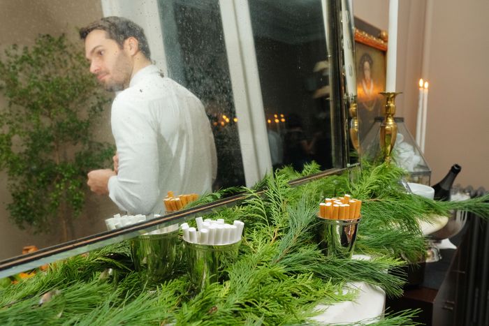Anyway, a few minutes later, I got a DM from a fabulous-looking 24-year-old chef with a fabulous name, Romilly Dauphin Newman, who told me she was co-hosting a “holiday fête” the following night at her friends’ place in Gramercy. Naturally, the first thing I did was Zillow the home and Google the hosts, Chris Hessney and Simon Miall, who I found out are a founder of a high-end events-production-and-design agency and a former pro-rugby player turned financier, respectively. They got married in 2018 in a 16th-century palazzo on Lake Como and invited Harper’s Bazaar as a guest; according to the resulting write-up, the rehearsal dinner was at a villa that once hosted Napoleon and Joséphine, and Simon arrived at the ceremony via boat. Needless to say, it all looked very White Lotus, and Chris and Simon seemed like what Jennifer Coolidge’s character might call “high-end gays,” though without, I assumed, any need to murder anyone for their money. The party was to take place at the brownstone they just moved into (it is, however, a rental), with all of Chris’s “closest friends and dearest clients” in attendance.