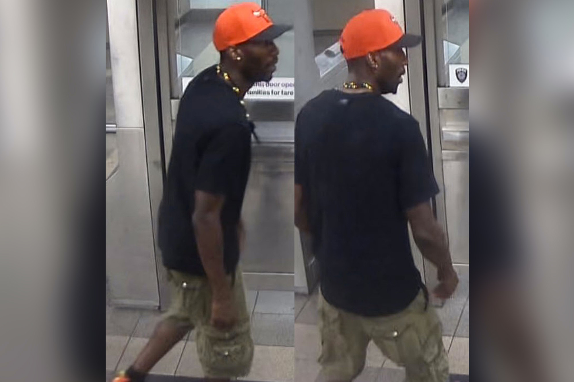 The suspect, shown in a surveillance image, has a dark complexion, is about 5 feet 11 and around 185 pounds, with a medium build and partial facial hair, police said.