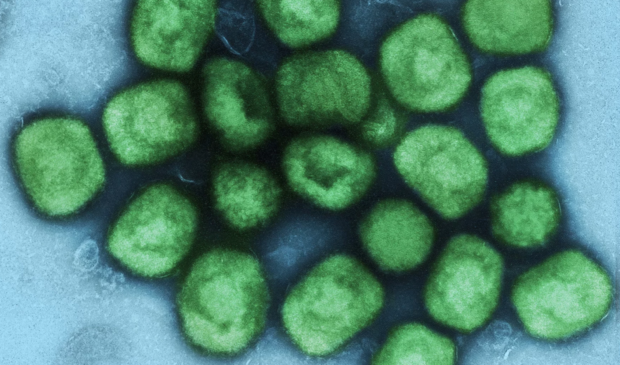 Photo caption: A colorized image of the monkeypox virus captured through a transmission electron micrograph.