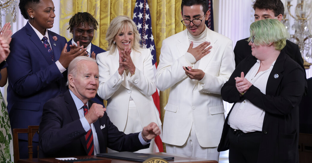 In a ceremony in the East Room packed with L.G.B.T.Q. supporters, Mr. Biden said he was moved to take action to prevent what he called “hateful attacks” by Republican governors and legislatures around the country.