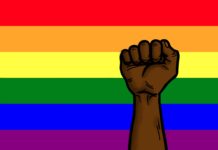 Gay pride rainbow flag with a fist hand raised of African-American person as a symbol of freedom, ... LGBTQI rights, racial equality and anti racism. concept. getty...