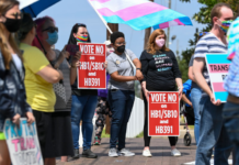 Opponents of several bills targeting transgender youth attend a rally at the Alabama State House to draw attention to anti-transgender legislation introduced in Alabama on March 30, 2021 in Montgomery, Alabama....