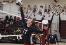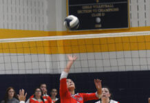 Lake Placid’s Julia Crawford, right, hits the ball with Saranac Lake’s Anica Null attempting to block during Monday’s match in Lake Placid.