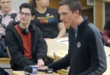Ryan Stock, who teaches at Northern Michigan University, speaks out against the removal of gay pride flags in classrooms during Monday’s meeting of the Gwinn Area Community Schools...