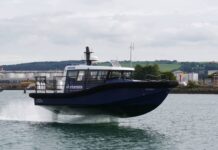 Artemis Technologies hydrofoiling workboat "Pioneer" out on Belfast Lough as the company unveiled plans for a 100% electric ferry. Brian Lawless/PA Wire/dpa