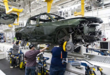 A Rivian R1T truck body lowered onto a chassis in the assembly line at the Rivian electric vehicle plant in Normal, Illinois. Georgia is giving the company $1.5 billion in subsidies...
