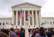 A man holds a U.S. and a rainbow flag outside the Supreme Court in Washington, D.C., on June 26, 2015,...