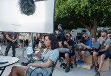 Aubrey Plaza on set in Noto. Photo: Fabio Lovino Two American women sit in a...