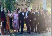 The happy couple pose for photographs in front of a wooden wedding temple festooned with flowers and vines.Pictures posted to social media show Phil Green and Kale Thompson enjoying their big...