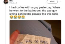 A woman’s tweet about her coffee date has gone viral after she posted a photo of the warning note a gay man passed her after her date stepped away.