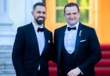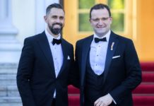 German Health Minister Jens Spahn, right, and his husband Daniel Funke, left, arrive July 5 at Bellevue presidential palace to attend a state banquet hosted by the...