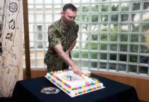 Capt. Rich Jarrett, commander of Fleet Activities Yokosuka, cuts a celebratory cake at a LGBT Pride Month cake-cutting ceremony on June 25, 2020. (Tetsuya Morita)