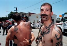 Woman looking lost in a sea of shirtless, leather-clad men at San Francisco gay...