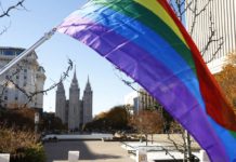 Pride flag flies in front of the Historic Mormon Temple in protest to a change in the Church of Jesus Christ of Latter-Day Saints policy towards married LGBT+ couples and their children...