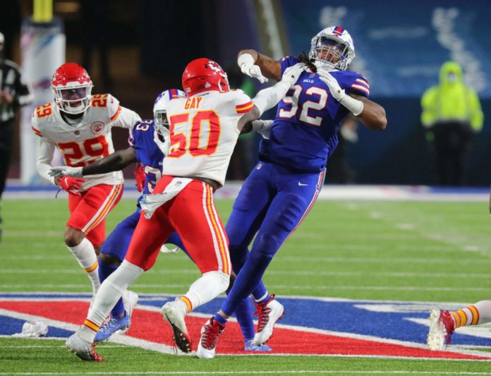 Getty Willie Gay Jr. of the Kansas City Chiefs blocks Darryl Johnson of the Buffalo Bills on a kickoff during the second half at Bills Stadium on October 19, 2020.