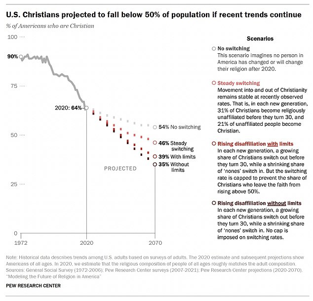 ‘If switching among young Americans continued at recent rates, Christians would decline as a share of the population by a few percentage points per decade, dipping below 50 percent by 2060,’ said the study.
