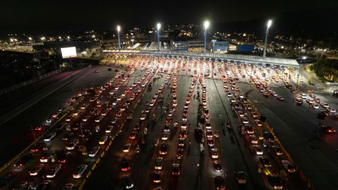 Though all the car lanes at San Ysidro were in use on Monday, only one pedestrian entrance was open. Another, closed throughout the travel ban, is blocked by an encampment of asylum seekers, who still cannot cross freely.