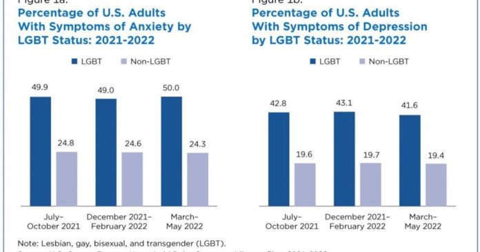 From December 2021 to February 2022, 49% of LGBT adults had symptoms of anxiety versus 24.6% of non-LGBT adults. In the same period, depression symptoms rates were 43.1% for LGBT adults, versus 19.7% for non-LGBT adults. From March to May 2022, 50% of LGBT adults had anxiety symptoms versus 24.6% of non-LGBT adults. In the same period, 41.6% of LGBT adults had symptoms of depression rates versus 19.4% for non-LGBT adults.