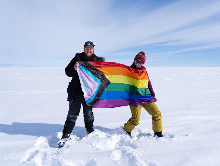 “There are probably only a few queer people in the ice core world,” he said. He had recently become friends with one of them, who had done fieldwork in Antarctica. “He said that he didn’t bring a Pride flag, but he wished he had, and that made me bring one.” When McCrimmon, who identifies as gay, brought out the flag, Sophia Wensman, a National Science Foundation Postdoctoral Research Fellow at DRI, was thrilled. “Her face just lit up” when McCrimmon and she posed with the flag on the ice. “Historically a lot of environments with big field expeditions are relegated to a certain subset of people. It’s nice to show that people of all walks of life are welcome in these types of experiences. You can be queer and come to the ice sheet and do cool science.”
