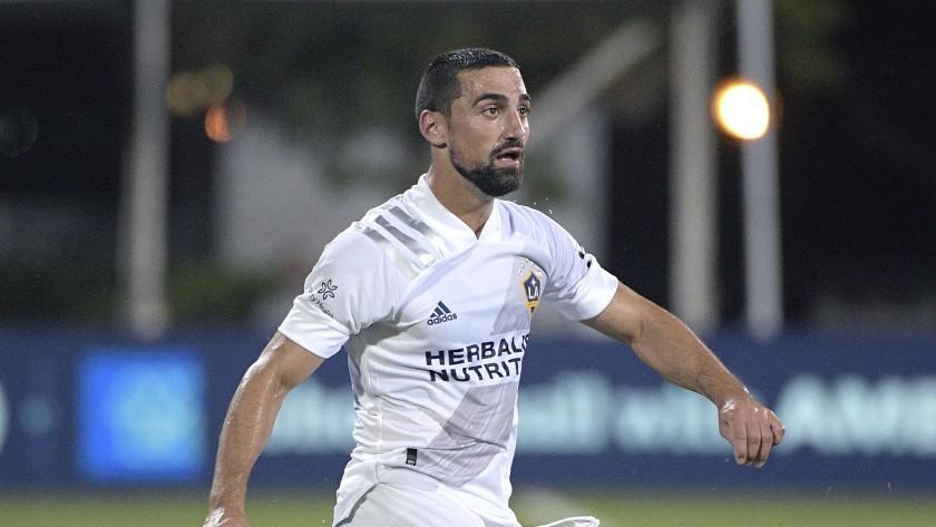 The Galaxy's Sebastian Lletget follows through on a kick against the Portland Timbers on July 13, 2020, in Florida.