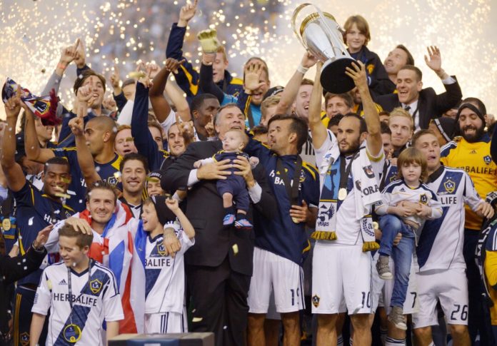 The Galaxy, including coach Bruce Arena, center, Landon Donovan and David Beckham celebrate winning the MLS Cup