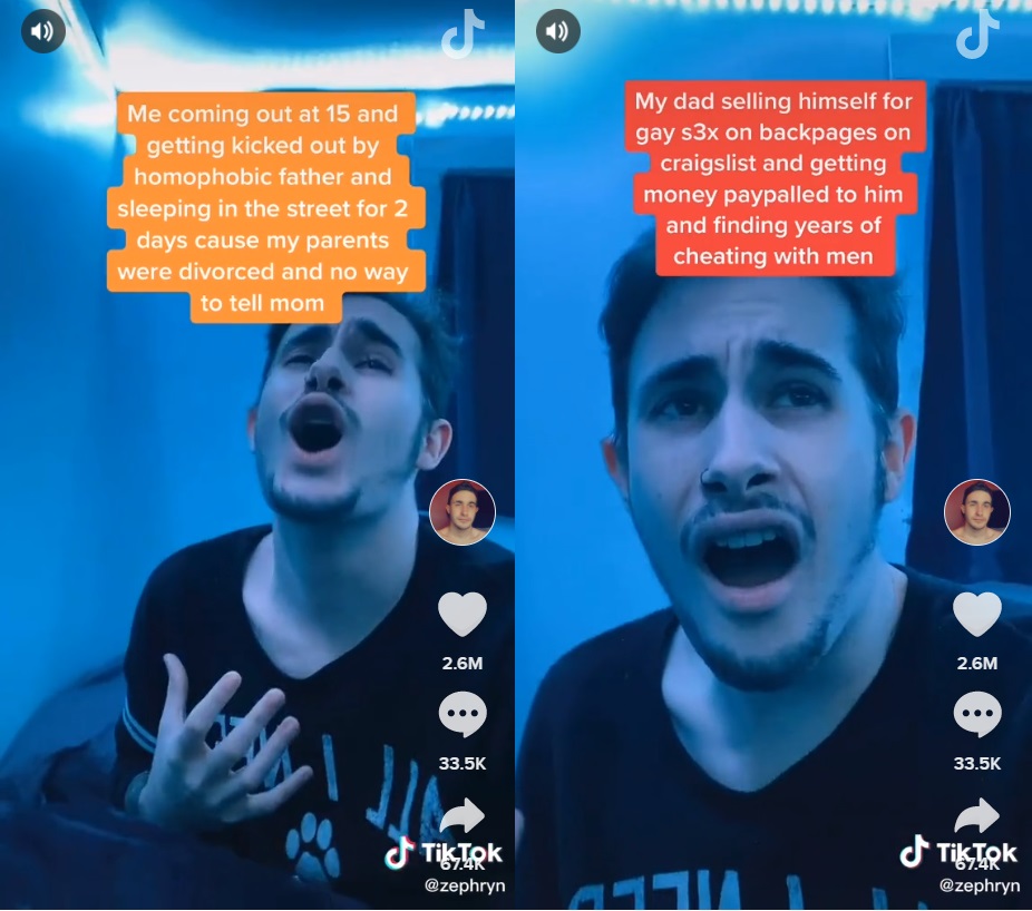 For @zephryn, the TikToker starts with the story of how his older sister was kicked out of the house by their homophobic father when she was 16. He then shares that he was raised “to be anything by gay.” Turns out, that didn’t work. As @zephryn got older his sexuality became a bigger issue and he was also kicked out of the house. Eventually, the family got a hold of the father’s old laptop and discovered he not only marketed himself for gay sex work on Craigslist, but he was photographed at an orgy as well. @zephryn then had the perfect way of sharing that news.