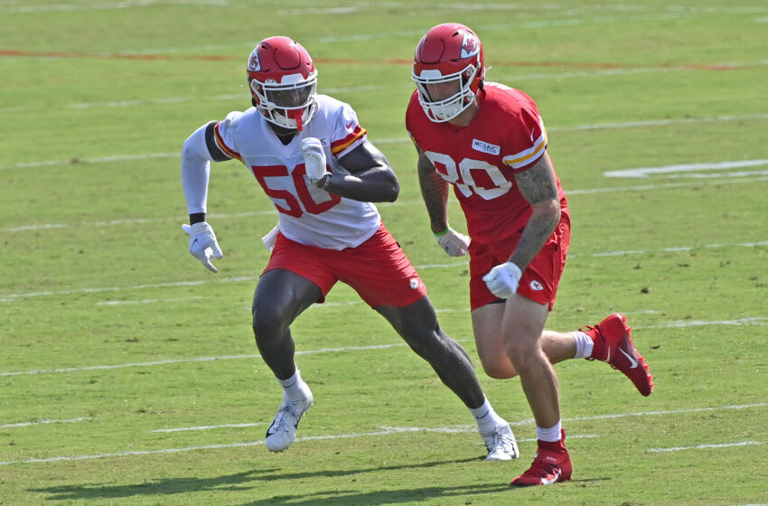 ST JOSEPH, MISSOURI – JULY 30: Linebacker Willie Gay #50 of the Kansas City Chiefs cover tight end Evan Baylis #80, during training camp at Missouri Western State University on July 30, 2021 in St Joseph, Missouri. (Photo by Peter G. Aiken/Getty Images)