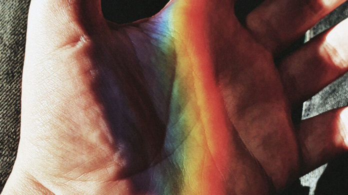 Close-up view of a rainbow reflection on a man's handShare on Pinterest