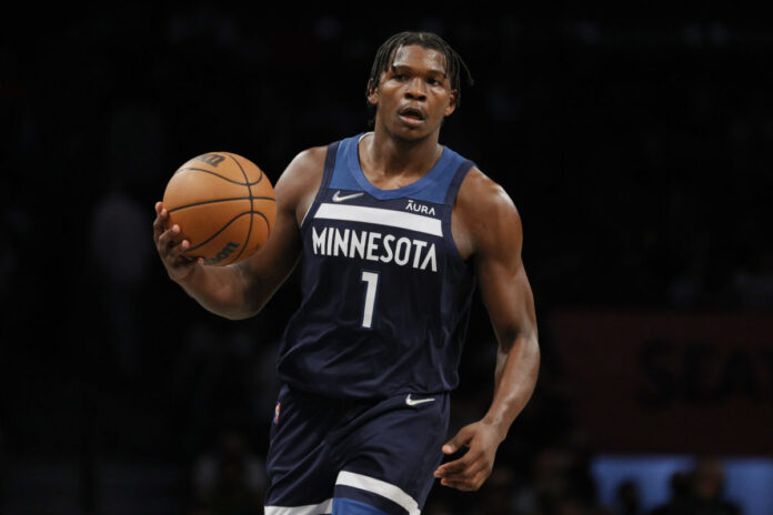 NEW YORK, NEW YORK – OCTOBER 14: Anthony Edwards #1 of the Minnesota Timberwolves dribbles during the second half against the Brooklyn Nets at Barclays Center on October 14, 2021 in the Brooklyn borough of New York City. The Nets won 107-101. (Photo by Sarah Stier/Getty Images)