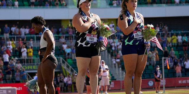 Gwendolyn Berry, left, looks away as DeAnna Price and Brooke Andersen stand for the national anthem after the finals of the women’s hammer throw at the U.S. Olympic Track and Field Trials Saturday, June 26, 2021, in Eugene, Ore. Price won, Andersen was second and Berry finished third. (AP Photo/Charlie Riedel) (AP)