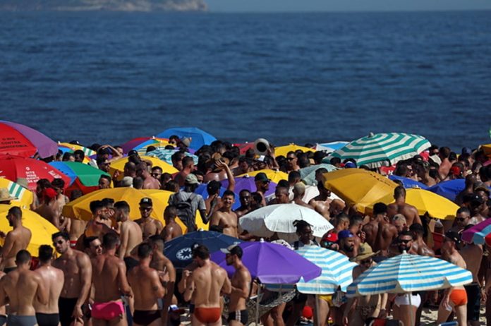 Men gather at Rio de Janeiro’s Ipanema beach in Brazil on Dec. 31, 2020.