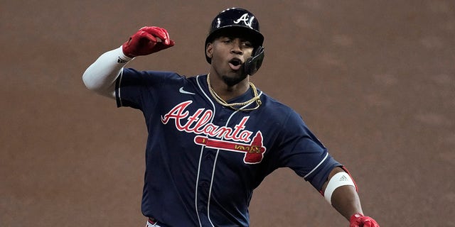 The Atlanta Braves’ Jorge Soler celebrates his home run during the first inning of Game 1 in baseball’s World Series between the Houston Astros and the Atlanta Braves Tuesday, Oct. 26, 2021, in Houston. (AP Photo/Eric Gay)