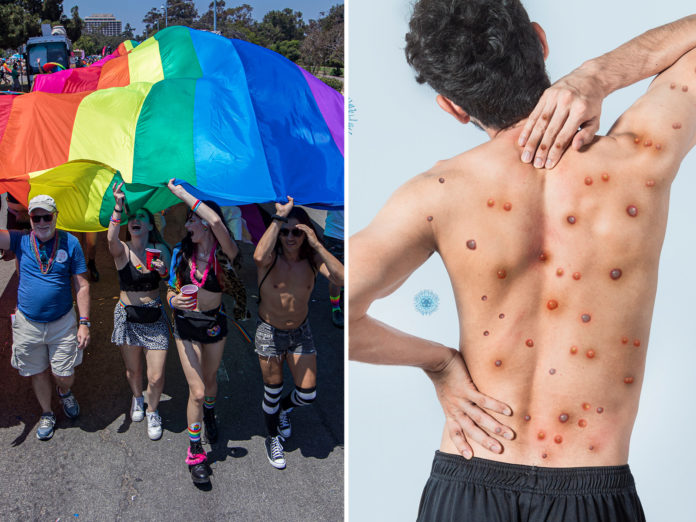 In this combination image, participants carry a large Pride Flag at 2022 San Diego Pride Parade on July 16, 2022 in San Diego, California and right a stock image representing Monkeypox