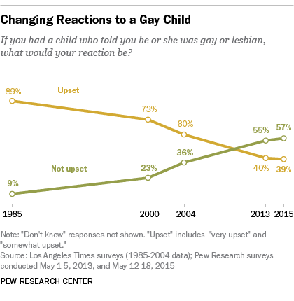 But views of homosexuality have shifted over time, and today nearly six-in-ten (57%) say they would not be upset if they had a child come out as gay or lesbian, according to a Pew Research Center survey conducted in May.