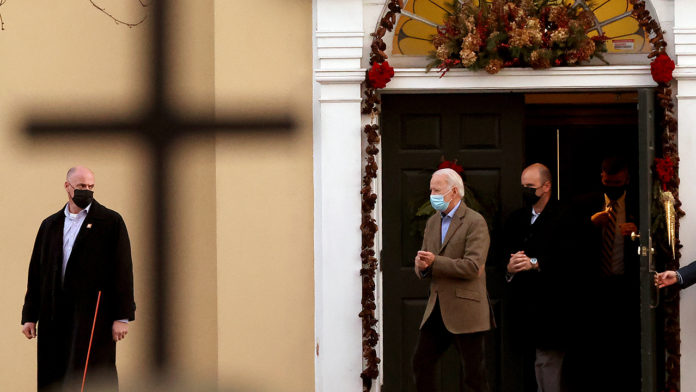 Shadowed by security detail, Joe Biden leaves St. Joseph on the Brandywine Roman Catholic Church, his home church in Wilmington, Delaware, on Jan. 9, 2021. (Chip Somodevilla/Getty Images)