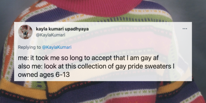 Image shows a background photo of a child in a rainbow striped sweater. There is a tweet over it that says "me: it took me so long to accept that I am gay af also me: look at this collection of gay pride sweaters I owned ages 6-13"