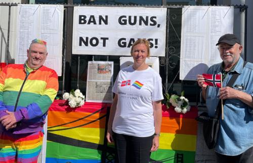 Gay activists Michael Petrelis, 63, and his longtime partner, Mike Merrigan, 71, had put the banner up June 22. They did not know that a few days later during Pride weekend a deadly shooting would take place in Oslo outside of the gay nightclub, another club, and a diner.