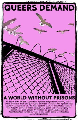 Queers Demand a World Without Prisons: “We reject hate crimes legislation, ‘gender-responsive’ prisons, and all other measures that use gay rights rhetoric to expand the systems that murder and imprison us. We are in solidarity against a prison industrial complex that targets people of color, immigrants, queer and trans people, sex workers, and poor people. We believe in queer imagination and transformative justice to build a new world based on liberation and interdependence.” Credit: Tyrone Boucher