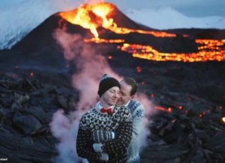 A gay couple in Iceland exchanged vows in front of an erupting volcano.