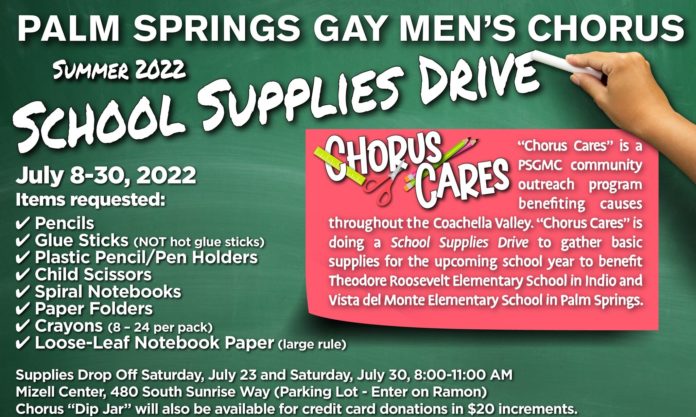 “The Palm Springs Gay Men’s Chorus is excited to announce the launch of our annual School Supplies Drive. While singing is our forte, our mission includes supporting the culturally diverse community in which we live. The School Supplies Drive is one of the tangible outreach initiatives, which reflect our values to promote civic responsibility, life-long learning, and singing. We invite you to join us in our efforts to collect much needed school supplies for two local elementary schools. The generous support of our community never ceases to amaze me,” said Victor Culatta, PSGMC Community Outreach Committee Chair.