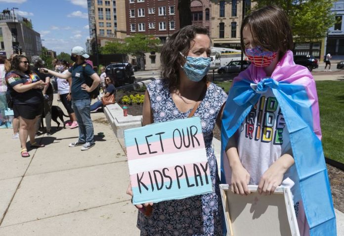 On May 26, Maddy Niebauer and her 10-year-old transgender son, Julian, from Middleton, Wis., take part in a rally for transgender rights at the Capitol in Madison, Wis. (Mark Hoffman/Milwaukee Journal-Sentinel via AP, File)