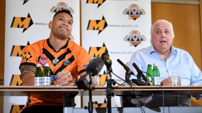 Palmer’s Mineralogy company is bankrolling Folau’s proposed bid to play rugby league for the Southport Tigers in Gold Coast’s A-Grade competition this year.