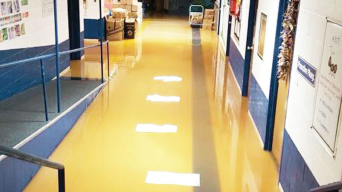 Water is shown in a hall at Ripley Elementary School after Wednesday night’s flooding. (Photo Provided)