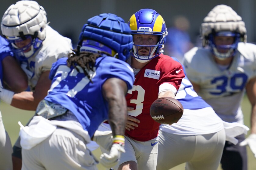 Rams quarterback John Wolford hands off to running back Darrell Henderson Jr. during a team practice on Aug. 6.
