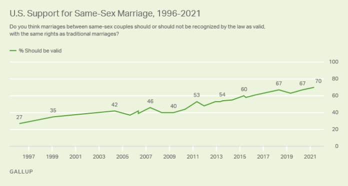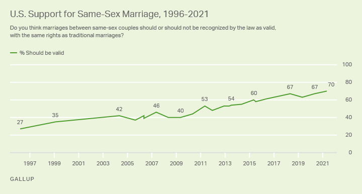 - Support for gay marriage at 70% for first time