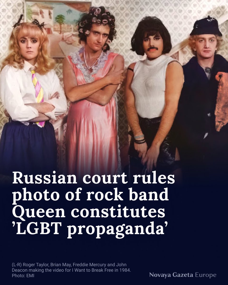 Home World Gay News Russian court rules photo of rock band Queen constitutes ’LGBT propaganda’ –... World Gay News Russian court rules photo of rock band Queen constitutes ’LGBT propaganda’ – Новая газета Европа By News Editor - February 2, 2026 21 0 Facebook Twitter Google+ Pinterest WhatsApp Russian court rules photo of rock band Queen constitutes ’LGBT propaganda’ Новая газета Европа Favorite RELATED ARTICLESMORE FROM AUTHOR World Gay News Several tourists arrested at PortMiami before âworldâs biggest gay festival at seaâ – WPLG Local 10 World Gay News Fake post about gay pandas draws crackdown in China – NewsNation World Gay News Is âHeated Rivalryâ the thing to change attitudes about gay pro athletes? – Lifestyle.INQ World Gay News Idaho bill to ban local protections against LGBTQ+ discrimination heads to House – Idaho Capital Sun World Gay News “Invest in community”: A gay mom built her own support network after Trump killed her business – LGBTQ Nation World Gay News Billie Jean Kingâs Ex-Husband Says He Found Out She Was Gay Just One Day Before It Hit the Press – People.com LEAVE A REPLY Cancel replyLog in to leave a comment