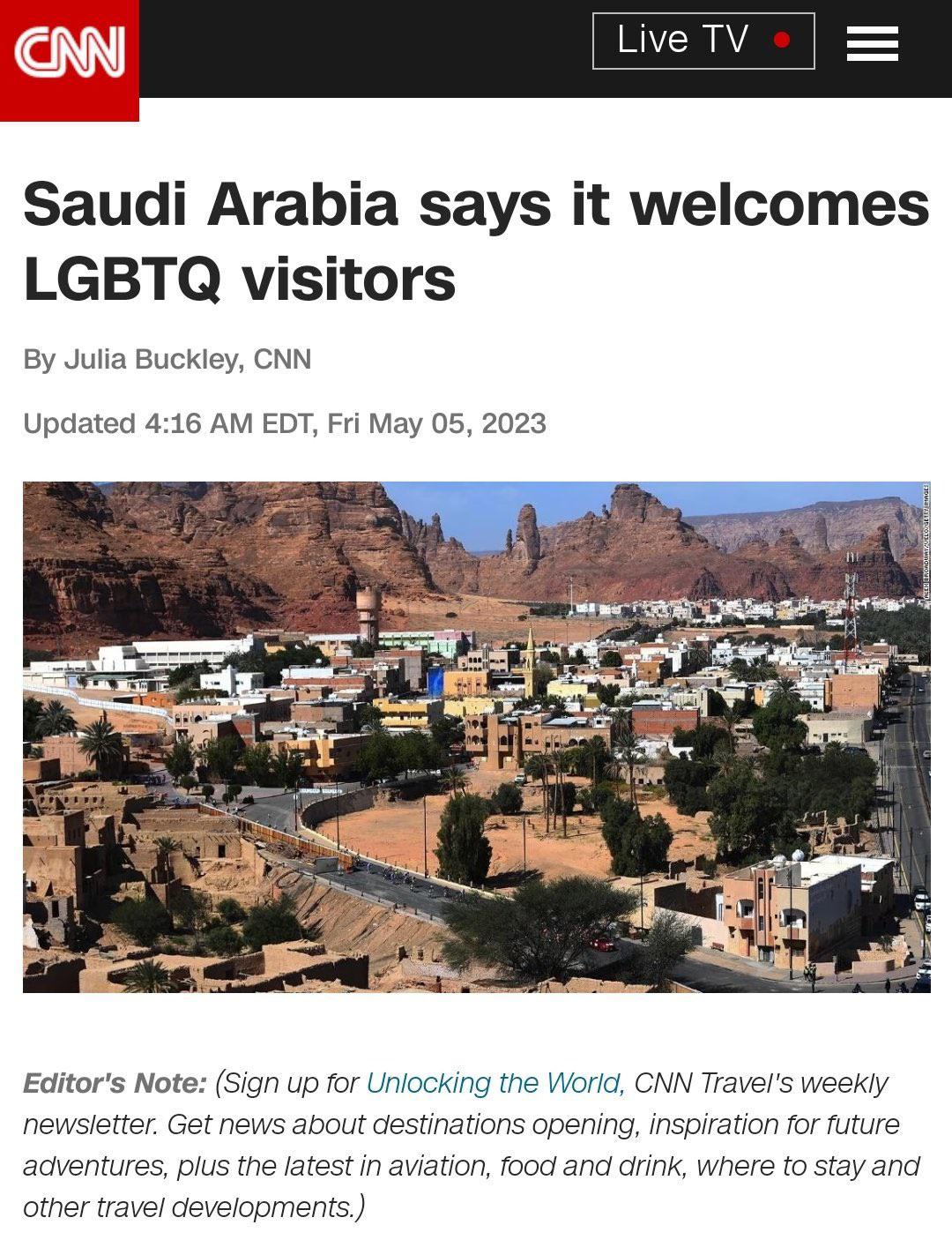 Home Travel Saudi Arabia says it welcomes LGBTQ visitors – cnn.com Travel Saudi Arabia says it welcomes LGBTQ visitors – cnn.com By Kim Martel - May 5, 2023 35 0 Facebook Twitter Google+ Pinterest WhatsApp Saudi Arabia says it welcomes LGBTQ visitors cnn.com Favorite RELATED ARTICLESMORE FROM AUTHOR Travel Is it safe to travel to Mexico? Latest advice after outbreak of violence – The Times Travel This gay content creator’s least favorite spots to solo-travel might surprise you – GayCities Travel Despite no LGBTQ pavilion, queer presence endures at NY Travel & Adventure Show – Gay City News Travel This TikTok couple perfectly summed up what it means to travel as queer people – gaycities.com Travel Top Gay Travel Destinations for 2026: The World Is Waiting – thecolu.mn Travel Toronto gay travel guide: Everything from the best bars to historic hot spots – attitude.co.uk
