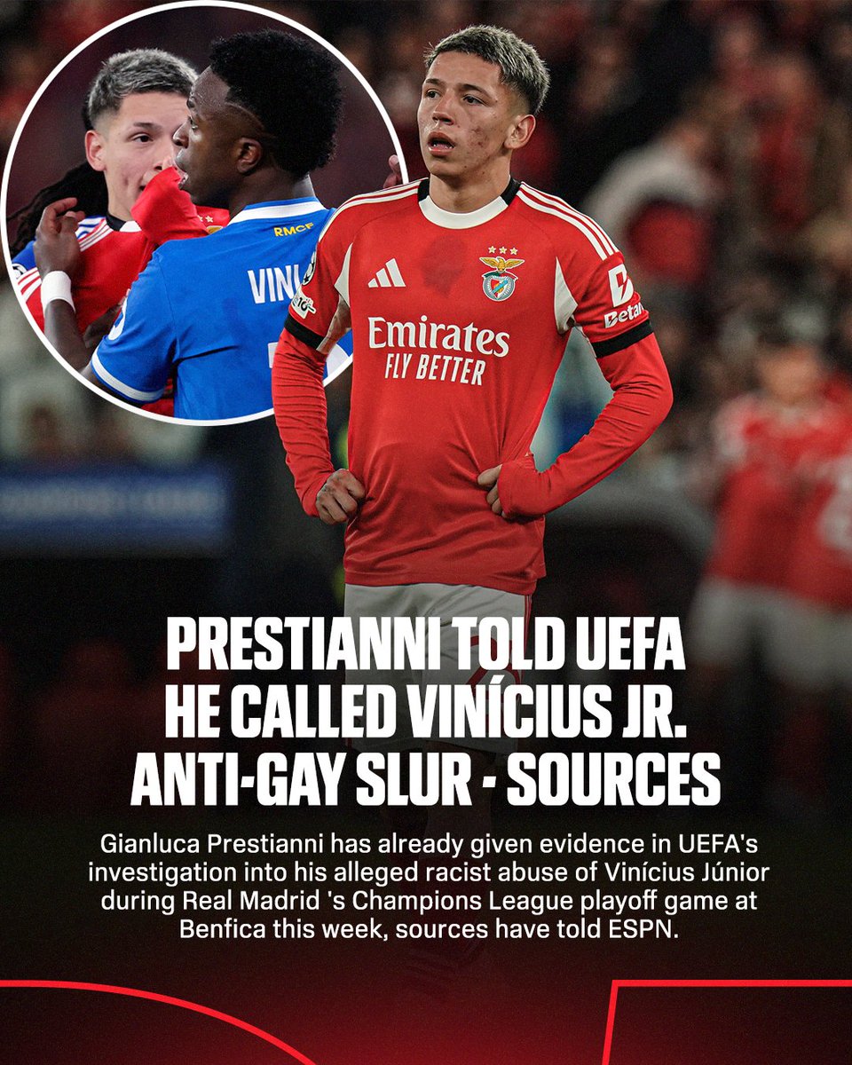 Home World Gay News Sources: Prestianni told UEFA he called VinÃcius Jr. anti-gay slur – ESPN World Gay News Sources: Prestianni told UEFA he called VinÃcius Jr. anti-gay slur – ESPN By Kim Martel - February 20, 2026 26 0 Facebook Twitter Google+ Pinterest WhatsApp Sources: Prestianni told UEFA he called VinÃcius Jr. anti-gay slur ESPN Favorite RELATED ARTICLESMORE FROM AUTHOR World Gay News Shia LaBeouf allegedly hurled gay slurs during bar brawl, arrest: police report – Page Six World Gay News Heated Rivalry creator Jacob Tierney on gay storytelling (EXCLUSIVE) – attitude.co.uk World Gay News Montgomery County agrees to pay parents who sued to stop LGBT school lessons – Washington Times World Gay News ‘Wired’ cover on ‘gay mafia’ meets social media storm – Mashable World Gay News The Olympic Womenâs Hockey Final Is Unprecedentedly Gay – them.us World Gay News Inside the Gay Tech Mafia – WIRED LEAVE A REPLY Cancel replyLog in to leave a comment