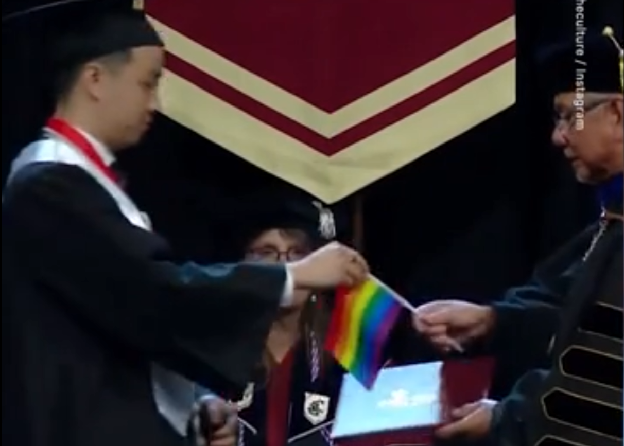 The protest culminated with students handing rainbow flags to SPU President Pete Menjares in exchange for their diplomas at their graduation ceremony.